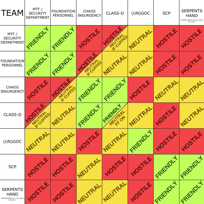 Chaos Insurgency Operatives have the objective to escort Class-Ds or Cuffed Foundation Personnel to the facility’s exit, and terminate all Foundation and GOC members. The Chaos Insurgency does not need to neutralize the SCPs, as they are neutral.